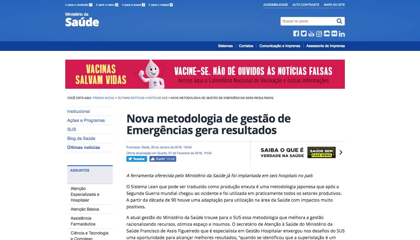 A atual gestão do Ministério da Saúde trouxe para o SUS essa metodologia que melhora a gestão racionalizando recursos, otimiza espaço e insumos. O secretário de Atenção à Saúde do Ministério da Saúde Francisco de Assis Figueiredo que é especialista em Gestão Hospitalar enxergou nos desafios do SUS uma oportunidade para alcançar melhores resultados, “quando se identificou que a superlotação é um problema de fluxo intra-hospitalar, passamos a racionalizar os recursos para qualificar o trajeto do paciente dentro das unidades” exemplifica o Secretário.